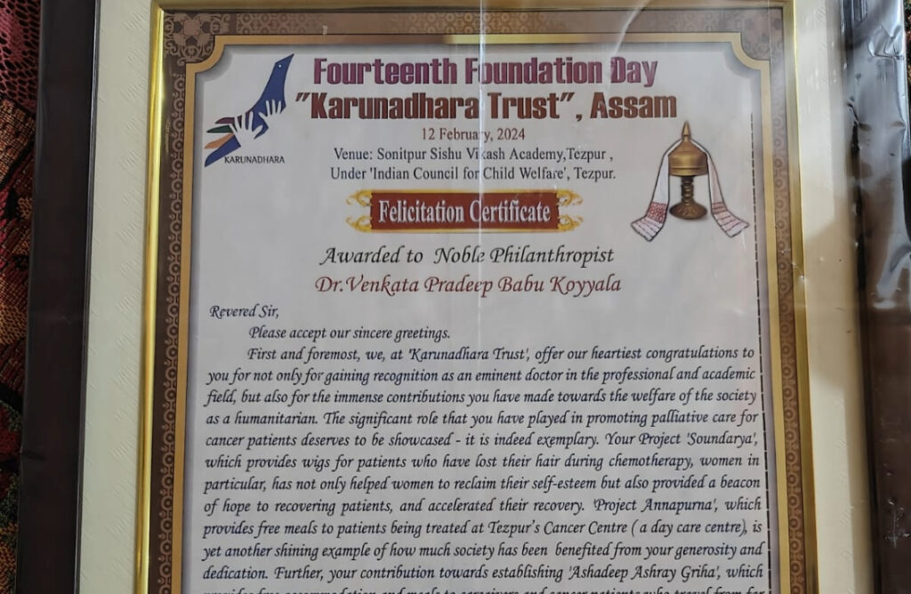 Awarded by "Karunadhara Trust" Assam to Dr. Venkata Pradeep Babu